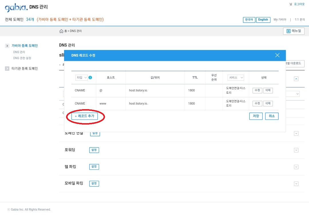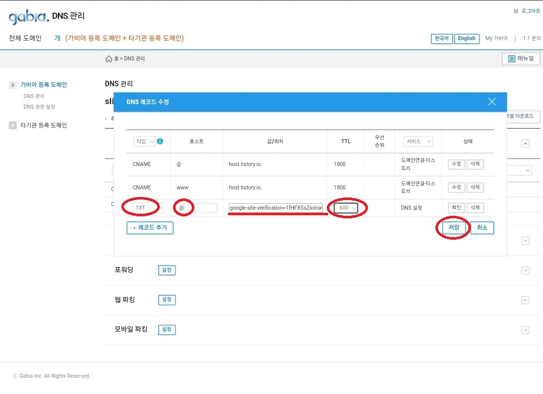 8. 타입: TXT, 호스트: @, TTL: 600-저장