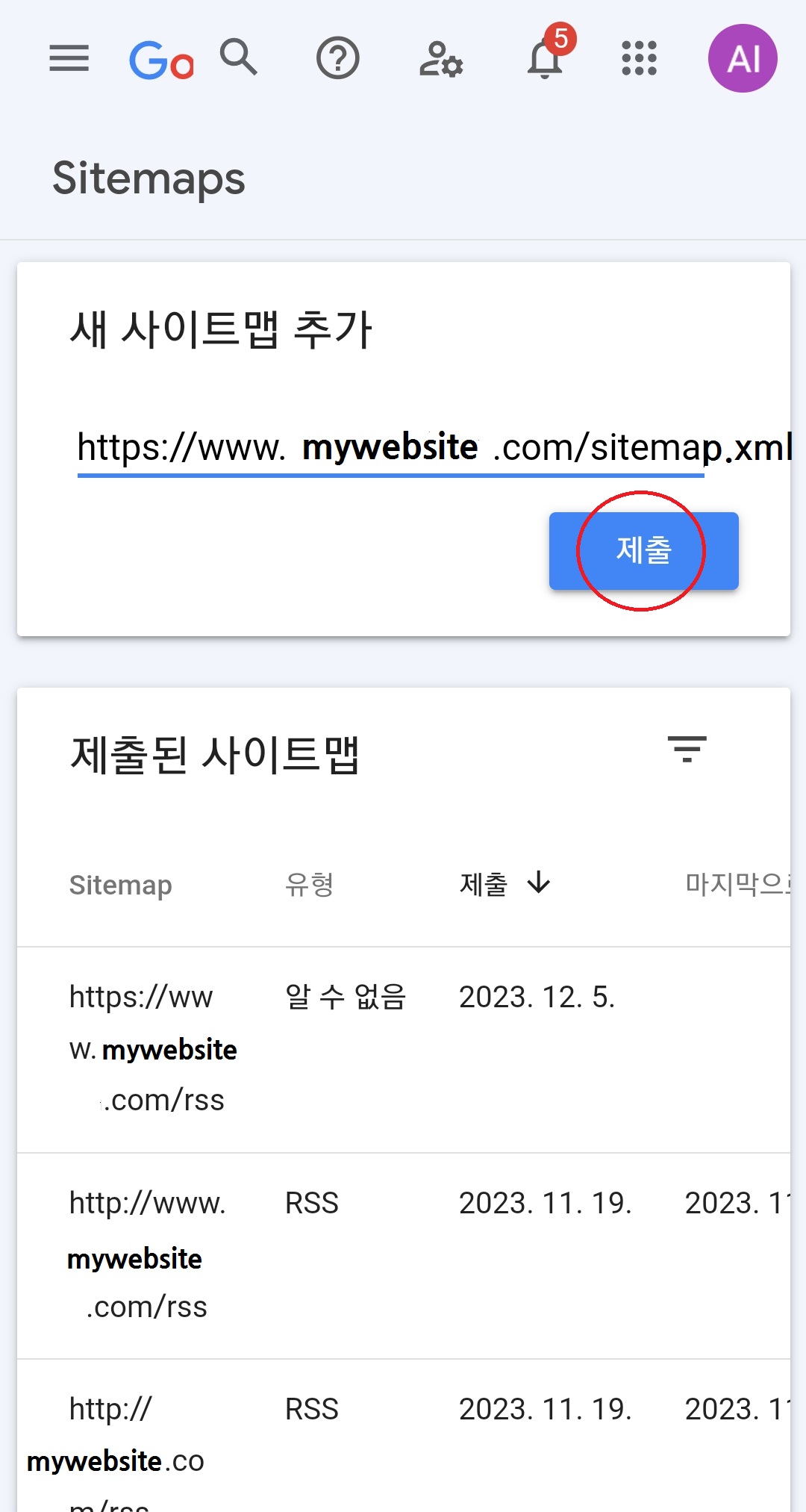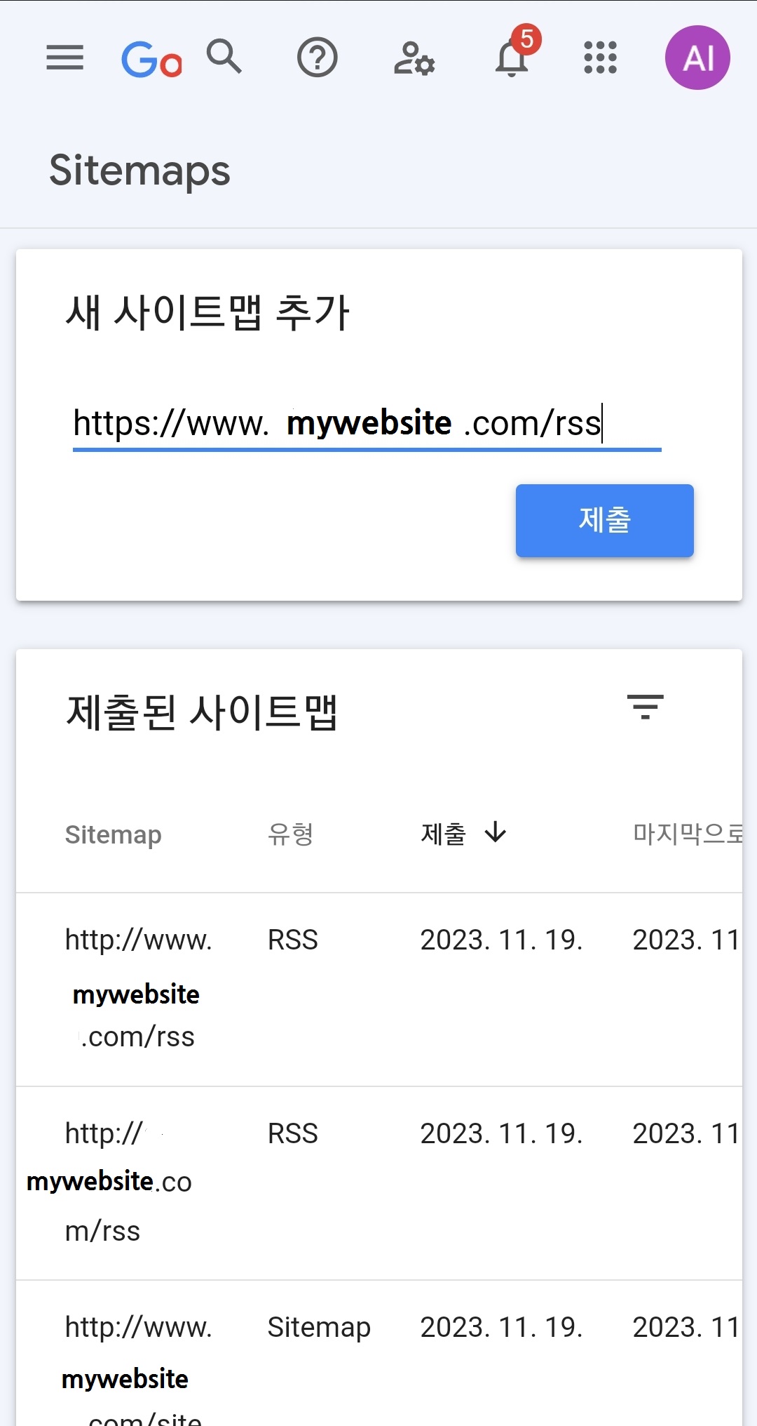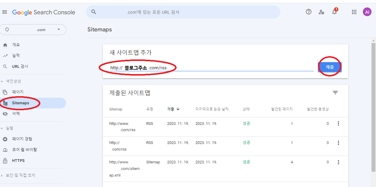 10. sitemaps-새 사이트맵 추가-블로그주소입력rss