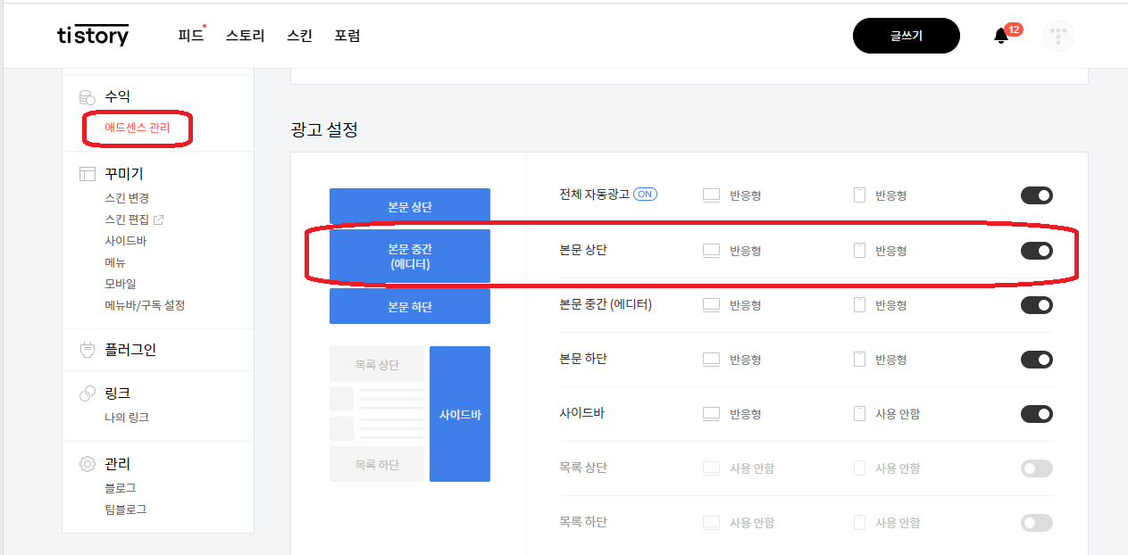 5. tistory설정-애드센스관리-본문중간(에디터)