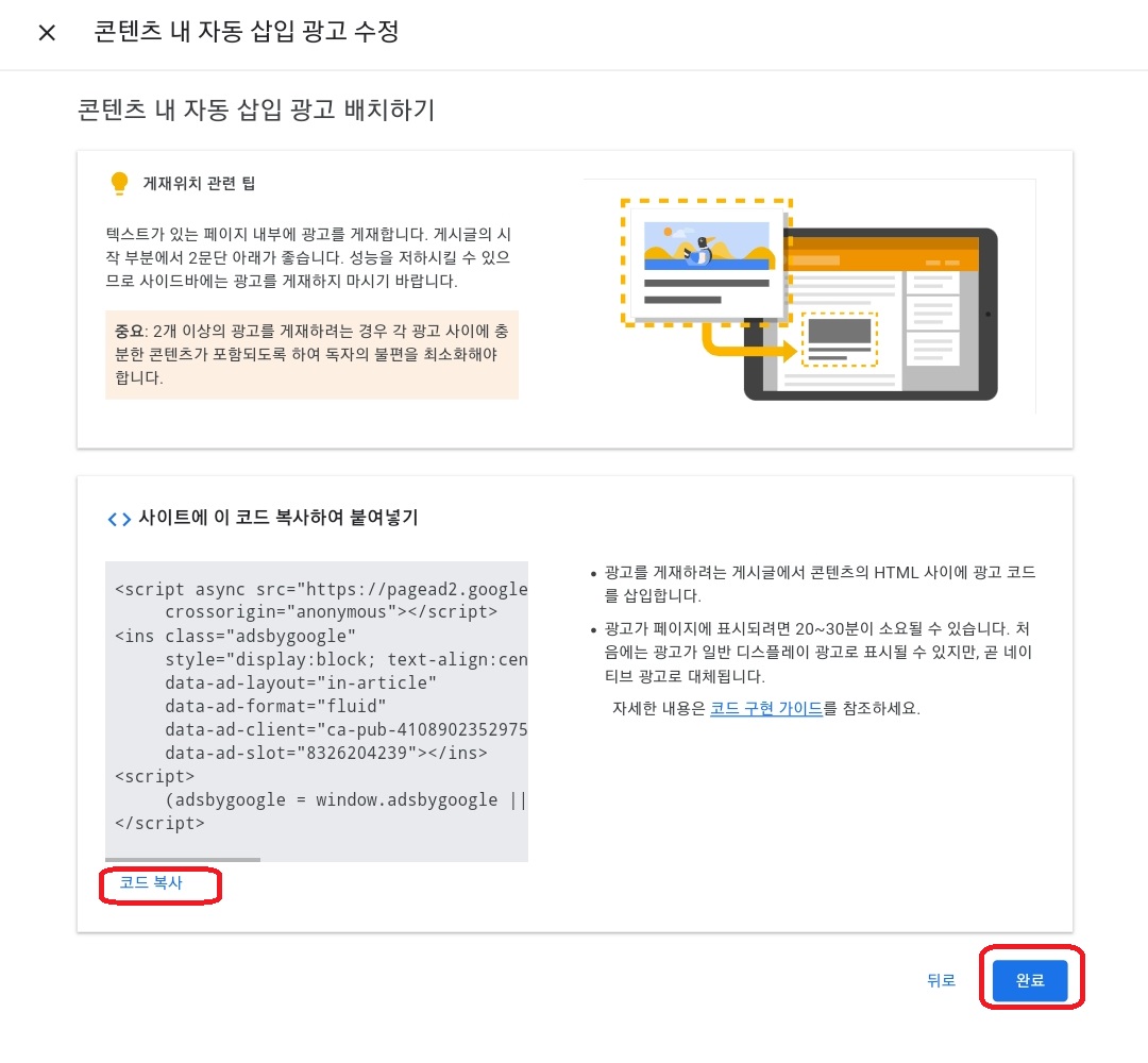 글 중간에 광고가 삽입되어 글을 읽는 중에 관련된 광고가 뜨면 클릭할 확률이 높으므로 설정하면 좋습니다.